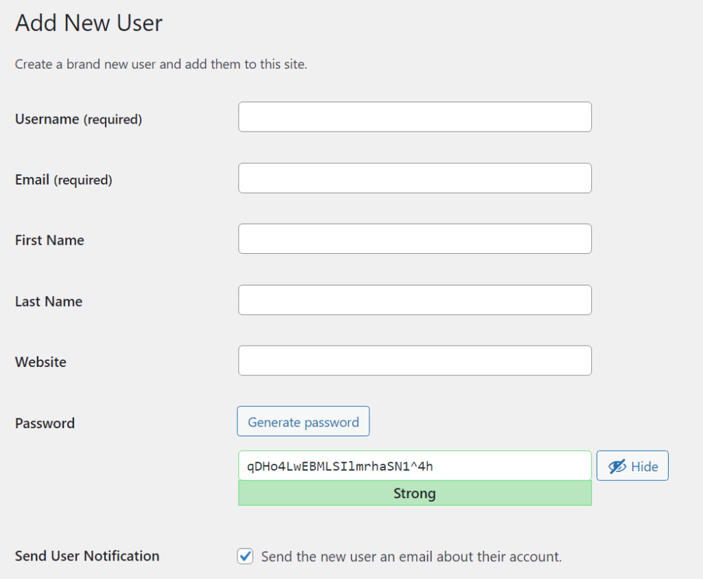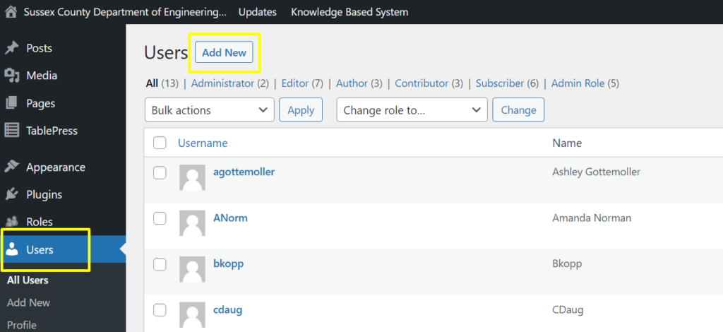 - Clicking the “Users” link in left side menu, then clicking “Add New” Button